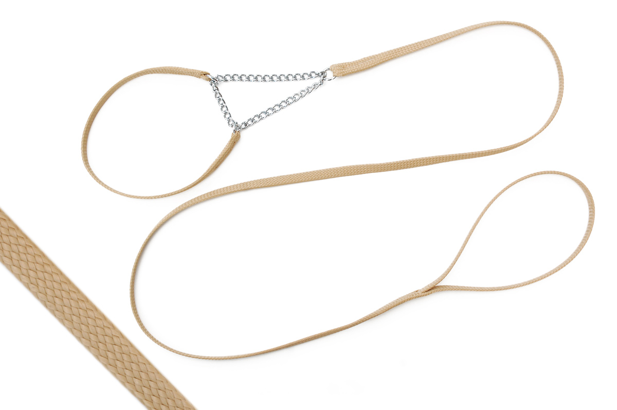 and features an integrated lead and collar with a chrome plated circle chain